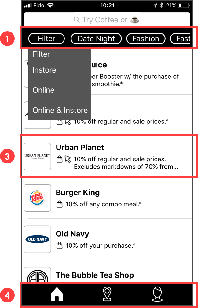 1 & 2. The filter system is cluttered with poor visibility, recognizability, and navigation - it’s effort-taking to find out and recall the right attributes. Besides, the tag ‘filter’ is a drop-down, containing a few mutually-exclusive options, whereas other tags (date night, fashion) are more like ‘categories’. These tags represent different perspectives of the businesses (location vs category) and react differently once interacted with (dropdown vs buttons) , but they do look identical.