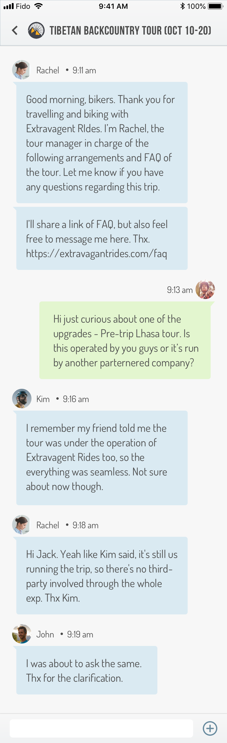 After the deposit is paid, Jack could join the group chat of the tour he’s going to and talk directly to the ambassador (leader of the trip), the tour company manager, and other companions in the same group.