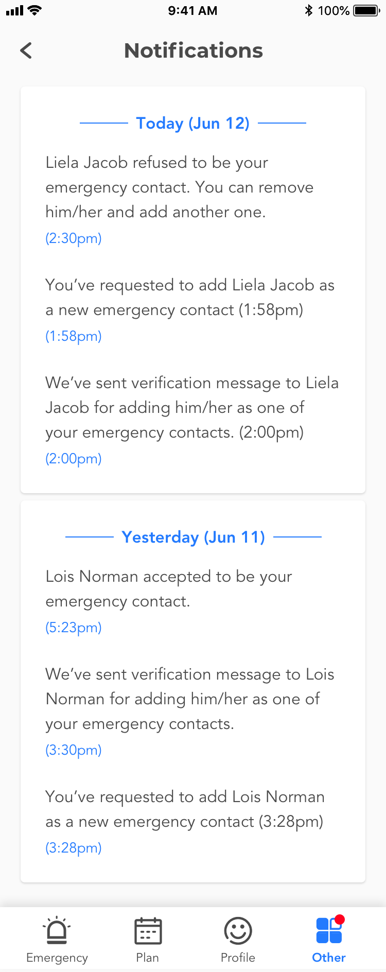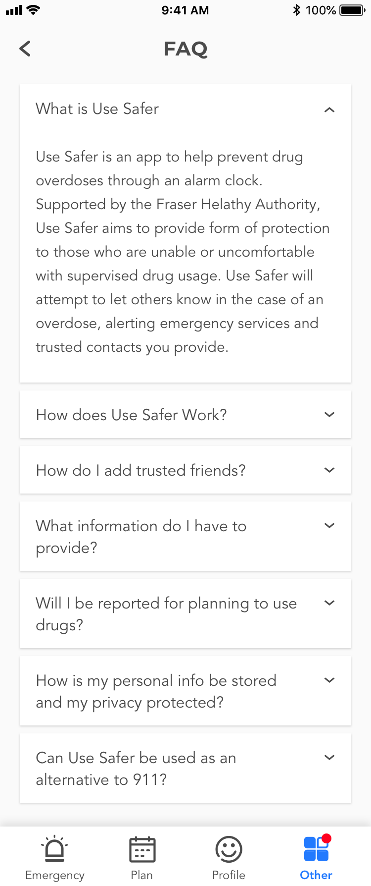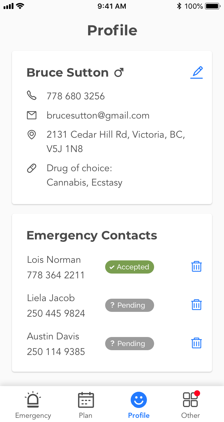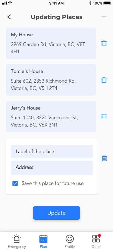 UI/Visual Design: By reworking the app design, I re-structured many functions and categorized them as Emergency, Plan, Profile and Others in the tab bar. As for visual design, I scrapped the entire old skin and only kept the color scheme, as blue is a neutral and safe color.